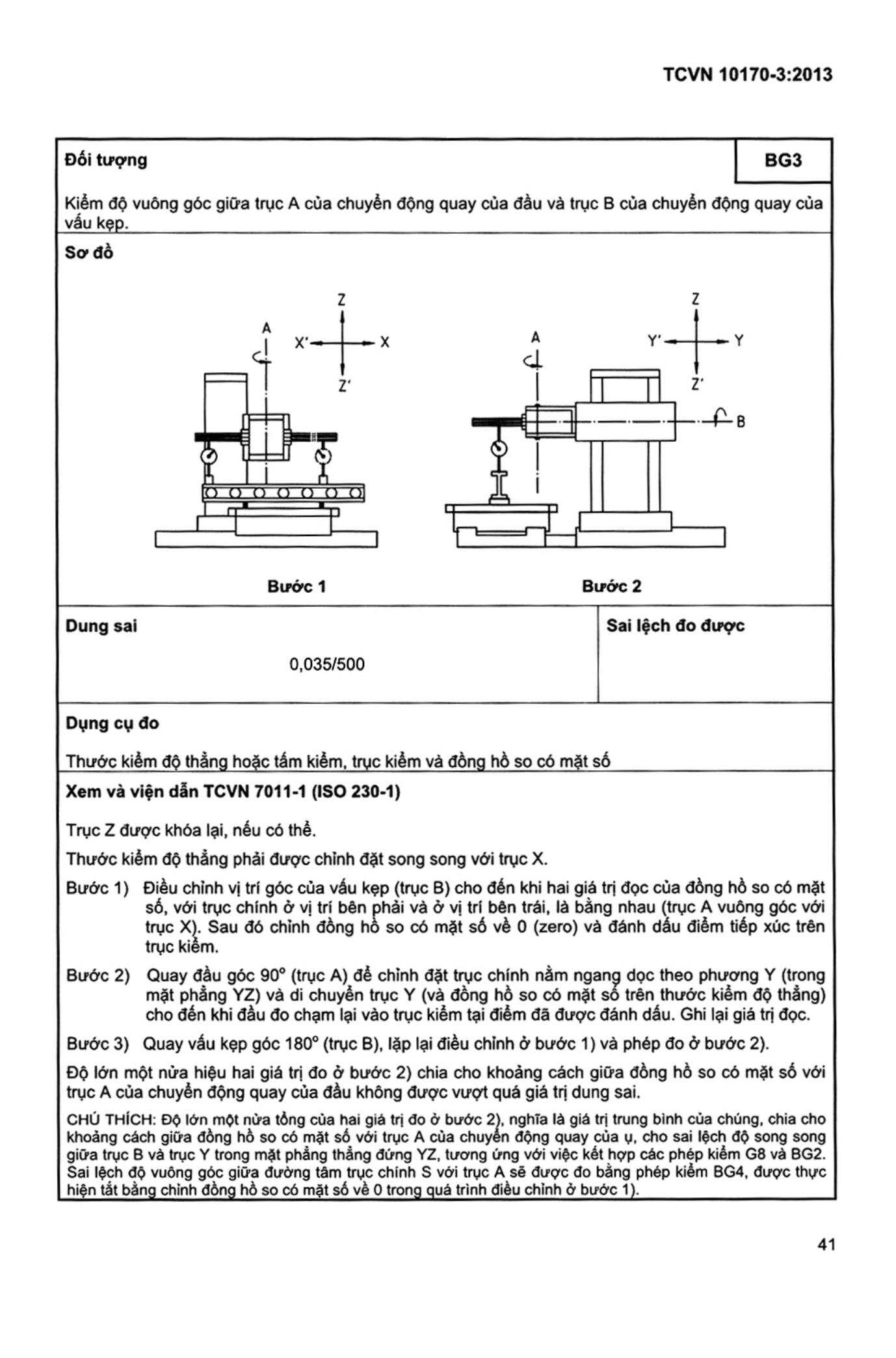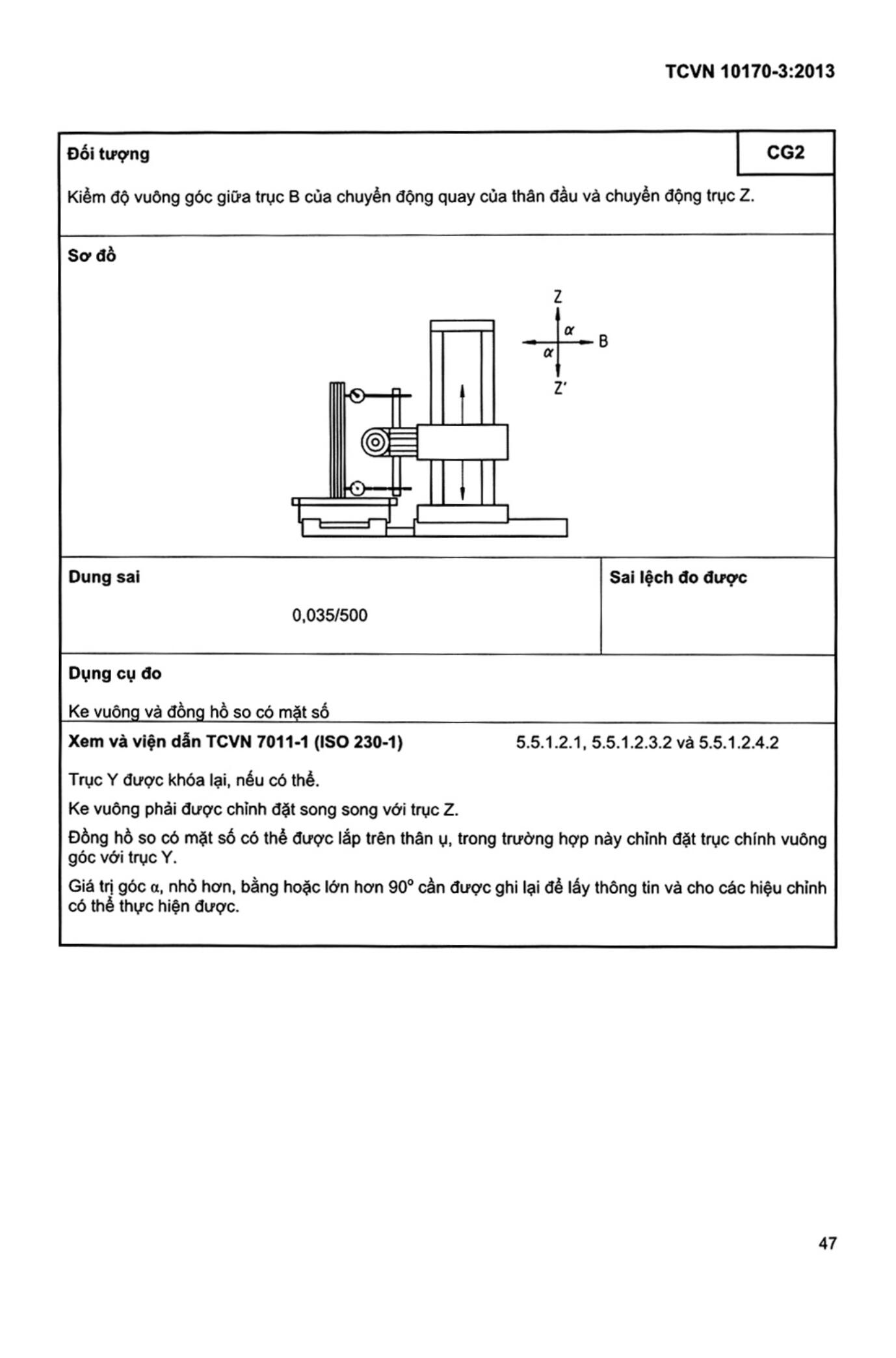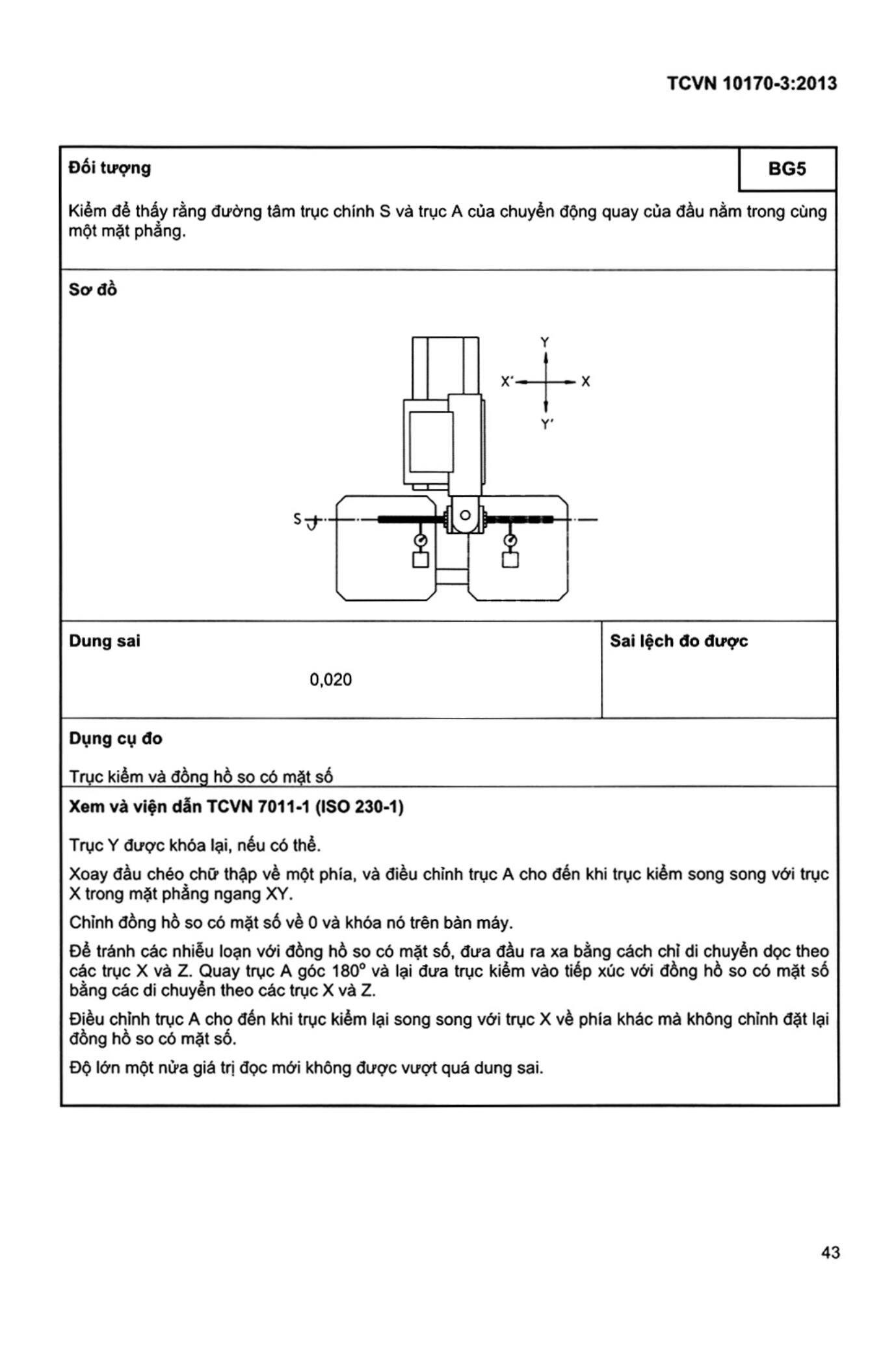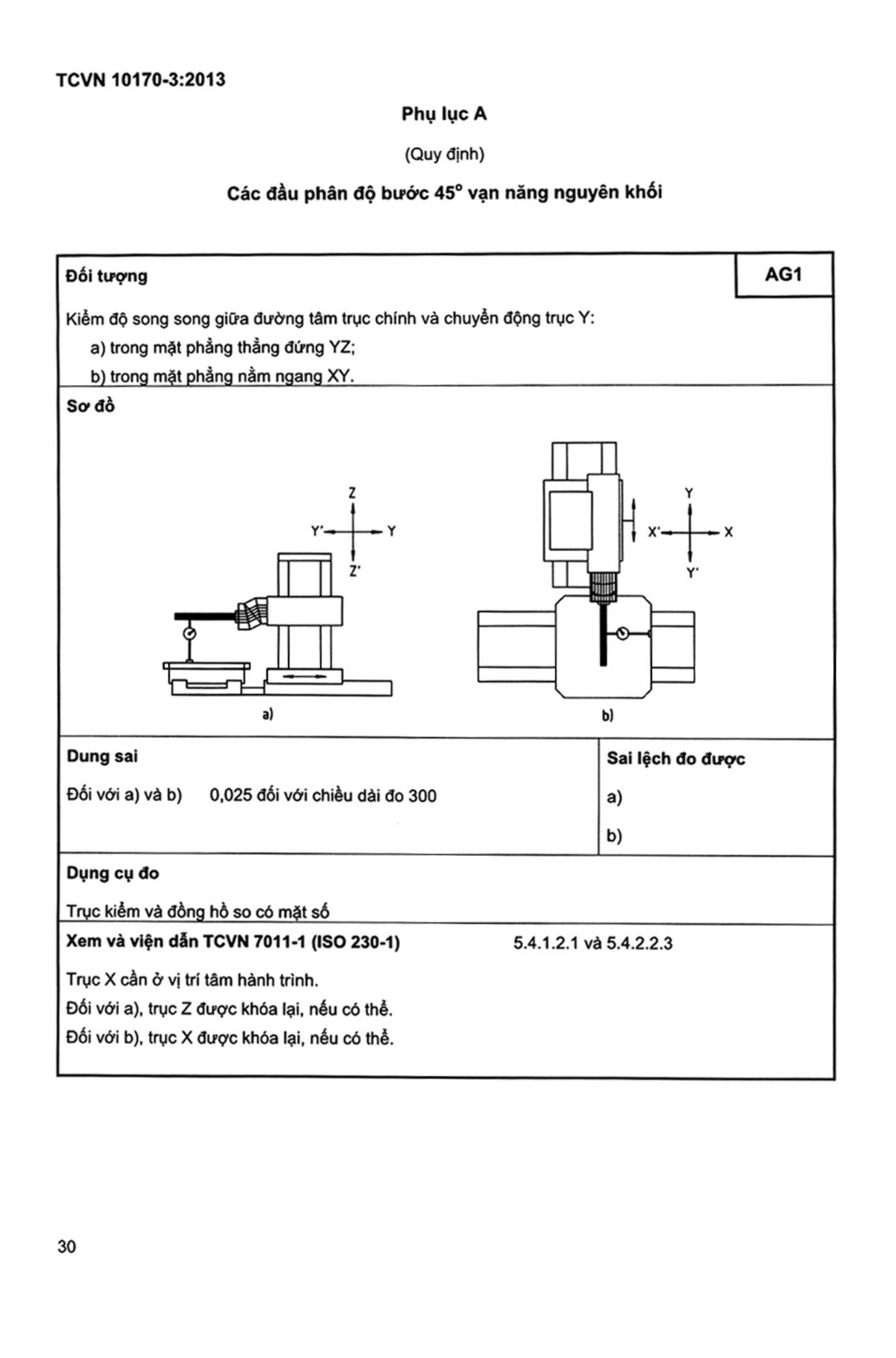 Tiêu chuẩn quốc gia TCVN 10170-3:2013 về Điều kiện kiểm trung tâm gia công - Phần 3: Kiểm hình học cho máy có các đầu phân độ nguyên khối hoặc vạn năng liên tục (trục Z thẳng đứng)
