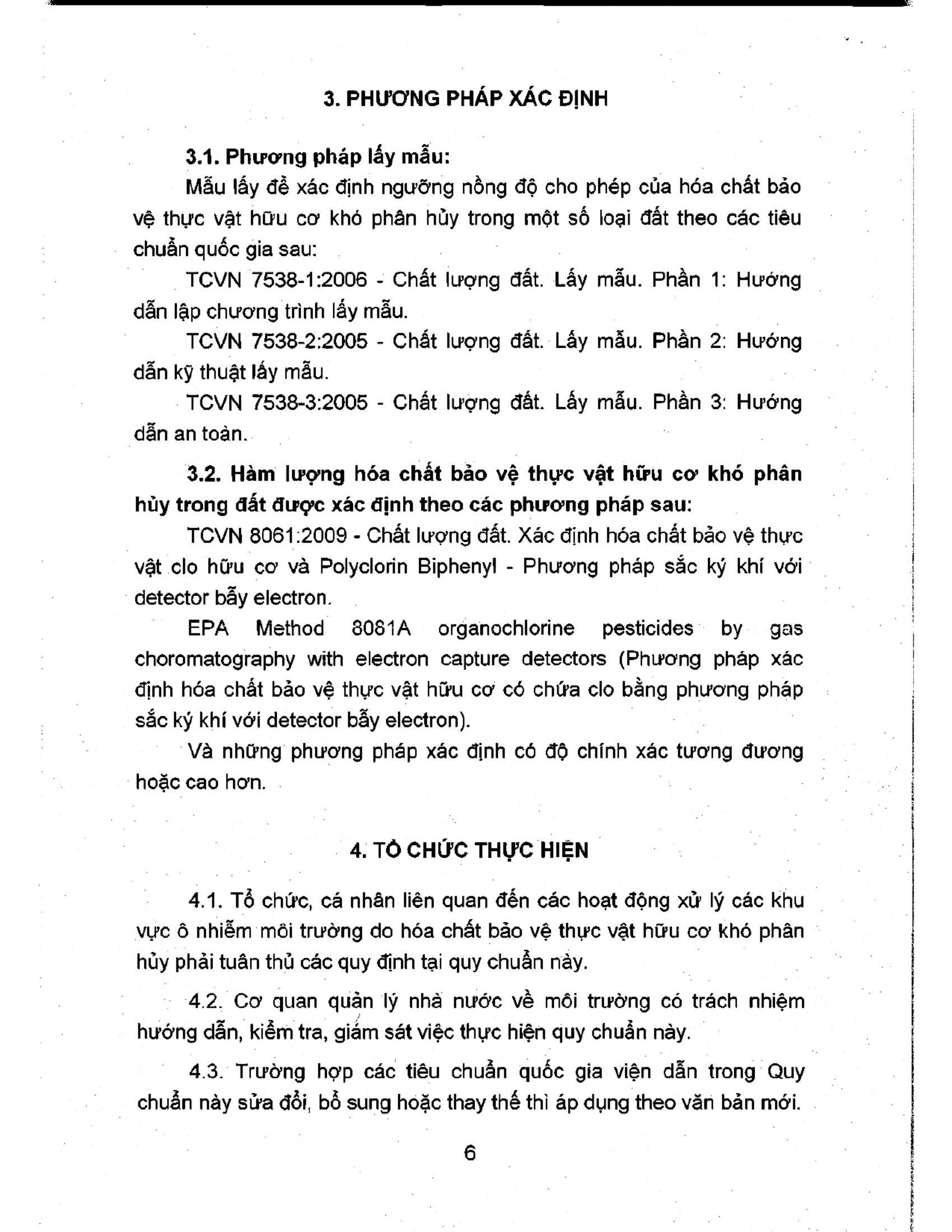 - 4Tiêu chuẩn quốc gia TCVN 8061:2009 (ISO 10382 : 2002) về Chất lượng đất - Xác định hóa chất bảo vệ thực vật clo hữu cơ và polyclorin biphenyl - Phương pháp sắc ký khí với detector bẫy electron